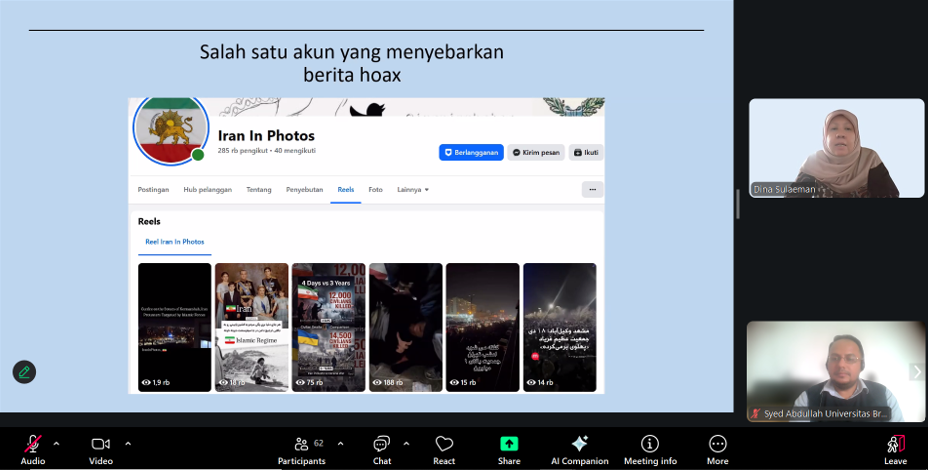 Jakarta, 16 Januari 2026 – Universitas Brawijaya melalui Iran Corner Fakultas Ilmu Sosial dan Ilmu Politik (FISIP) UB, bekerja sama dengan Islamic Culture and Relations Organization (ICRO) Jakarta, menggelar webinar internasional bertajuk “Iran di Balik Pemberitaan Media: Fakta Lapangan dan Narasi Barat” pada Kamis, 15 Januari 2025. Kegiatan yang diselenggarakan secara daring ini menghadirkan akademisi dan analis internasional untuk mengkaji perbedaan antara kondisi faktual di Iran dan framing media Barat.