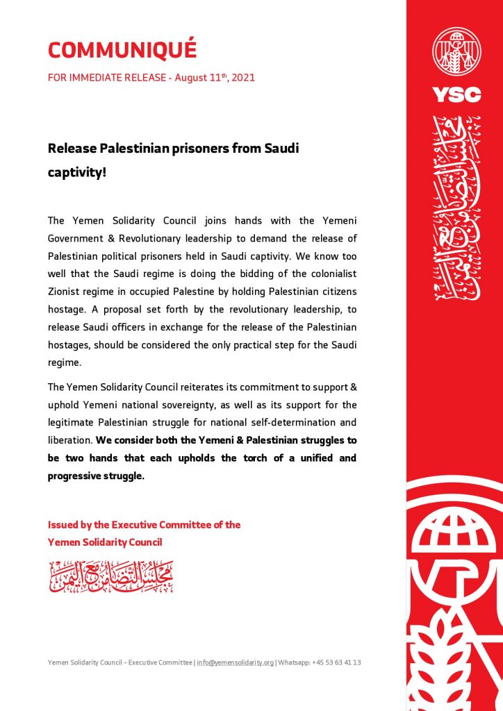 Dewan Solidaritas Yaman bersama dengan Pemerintah Yaman dan kepemimpinan Revolusioner menuntut pembebasan tahanan politik Palestina yang kini ditahan oleh rezim monarki Arab Saudi.
