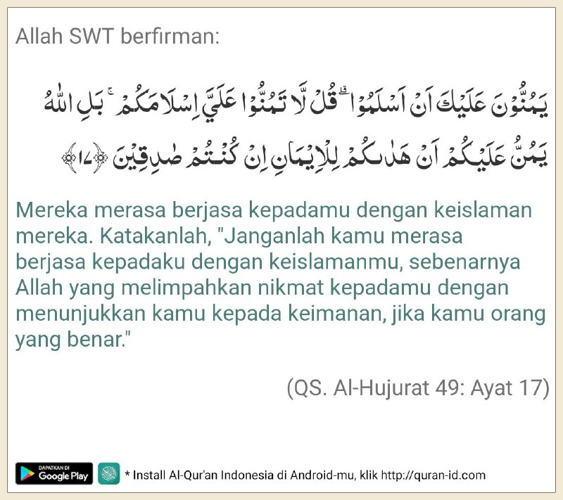 Dalam ayat ini’, “iman” justru disebut sebagai pamrih atau karunia (minnah) dari Allah kepada manusia, yang dengannya, manusialah yang harus bersyukur kepadaNya. Di ayat yang lain juga ditegaskan bahwa pengutusan para nabi adalah pamrih atau karunia Allah kepada manusia. Perhatikan Ali Imran ayat 164 yang berbunyi: “Sungguh Allah telah memberi karunia (laqad manna) kepada orang-orang yang beriman ketika Allah mengutus di antara mereka seorang rasul dari golongan mereka sendiri.”