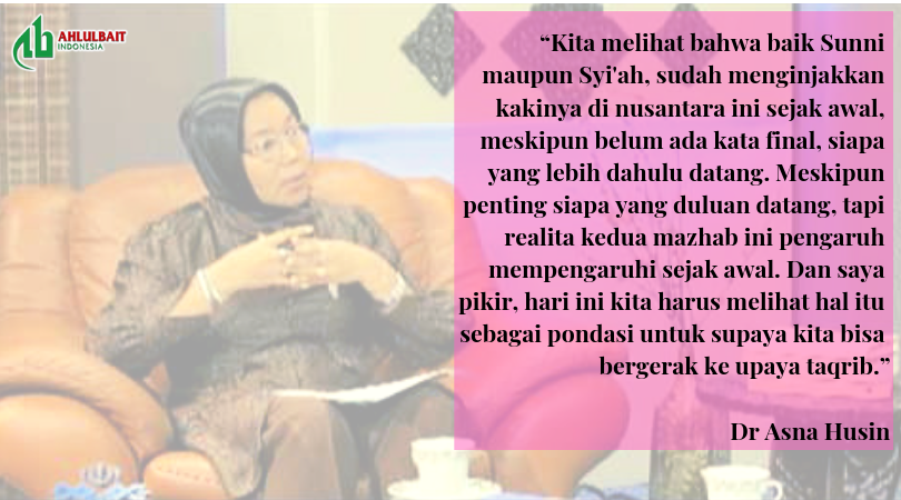 “Kita melihat bahwa baik Sunni maupun Syi’ah, sudah menginjakkan kakinya di nusantara ini sejak awal, meskipun belum ada kata final, siapa yang lebih dahulu datang. Meskipun penting siapa yang duluan datang, tapi realita kedua mazhab ini pengaruh mempengaruhi sejak awal. Dan saya pikir, hari ini kita harus melihat hal itu sebagai pondasi untuk supaya kita bisa bergerak ke upaya taqrib” (Dr. Asna Husin)