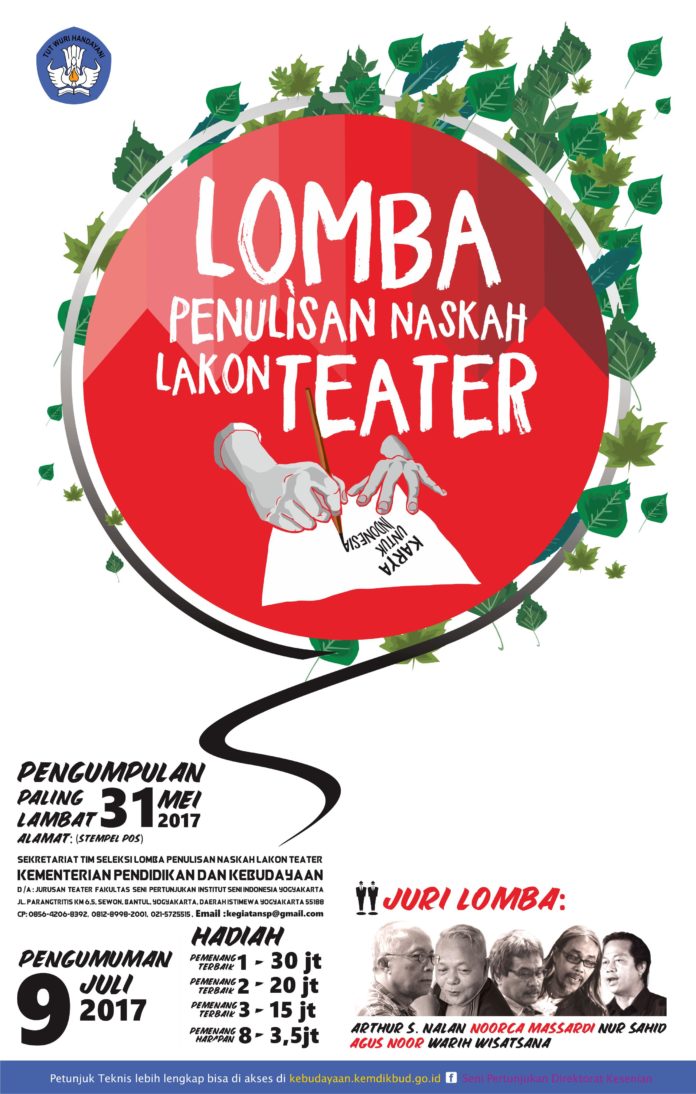 JAKARTA – Dalam rangka kegiatan Pekan Teater Nasional 2017, Direktorat Kesenian, Direktorat Jenderal Kebudayaan, Kementerian Pendidikan dan Kebudayaan (Kemdikbud) menggelar lomba Penulisan Naskah Lakon Teater. Kegiatan dikemas dalam bentuk kompetisi/lomba untuk mewadahi kreativitas penulis-penulis lakon di seluruh Indonesia. Lomba ini diharapkan mampu memotivasi para penulis lakon teater, terutama talenta muda untuk ikut berkompetisi melahirkan karya naskah lakon teater yang mempunyai gaya personal yang kuat.