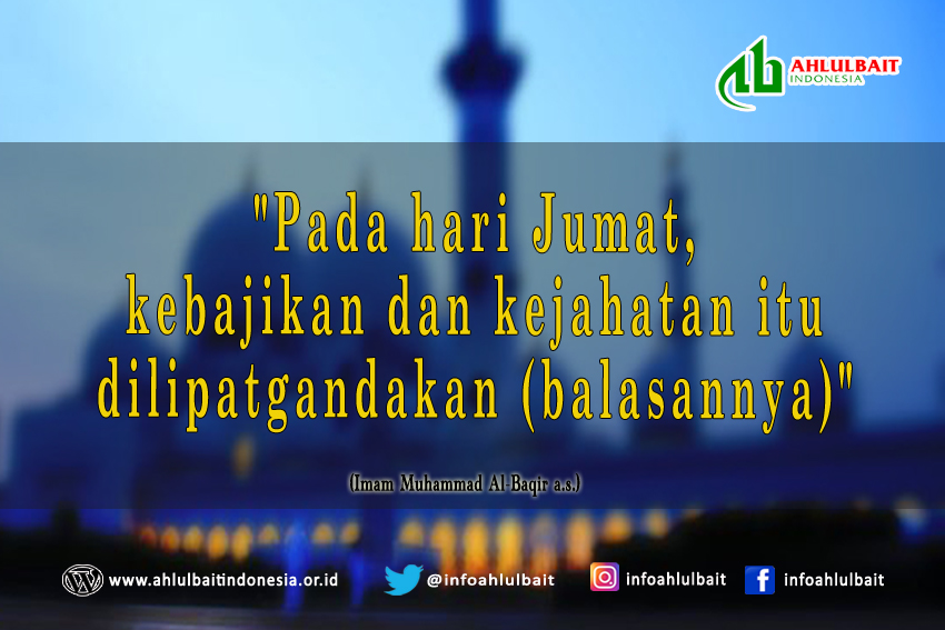 Berita Keutamaan Hari Jumat Published 8 tahun ago on 20 Oktober, 2017 By Ahlulbait Indonesia “Pada hari Jumat kebajikan dan kejahatan itu dilipatgandakan (balasannya)” (Imam Muhammad Al-Baqir a.s.) Related Topics:Ahlulbait IndonesiaHarijumatkebajikanKejahatanKeutamaan Up Next Rakornas II Muslimah Ahlulbait Indonesia Don't Miss Celaka bagi Orang yang Lalai terhadap Salatnya Continue Reading You may like Resmi Ditetapkan, DPD ABI dan Muslimah ABI Terima SKK dari Bakesbangpol Lumajang Di Tengah Hujan Deras, ABI Situbondo Tetap Galang Dana untuk Korban Banjir Sumatra dan Aceh Jangan Sungkan Melabeli Diri sebagai Orang ABI Bulan Rajab dan Jalan Pintas Mencapai Spiritualitas #PODCAST | ABI Tawarkan Blueprint “Beragama Maslahat” sebagai Fondasi Pembangunan Nasional Beragama Maslahat? Green Religion? Click to comment Leave a Reply Batalkan balasanAlamat email Anda tidak akan dipublikasikan. Ruas yang wajib ditandai *Komentar * Nama * Email * Situs Web