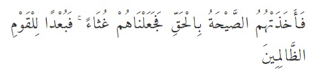 Rasul itu berdoa, ”Ya Tuhanku! Tolonglah aku karena mereka mendustakanku. ” Allah berfirman, ”Dalam sedikit waktu lagi pasti mereka akan menjadi orang-orang yang menyesal. ” Maka dimusnahkanlah mereka oleh suara yang mengguntur dengan hak dan Kami jadikan mereka (sebagai) sampah banjir maka kebinasaanlah bagi orang-oran g yang zalim itu (QS. al-Mu’minun [23]:39-41).”