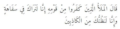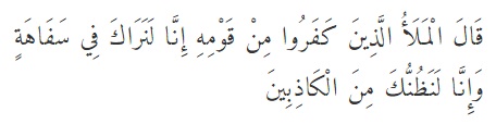 Pemuka-pemuka yang kafir dari kaumnya berkata, ”Sesungguhnya kami benar-benar memandangmu dalam keadaan kurang akal dan sesungguhnya kami menganggap engkau termasuk orang-orang yang berdusta. “ (QS. al-A’raf [7]: 66)