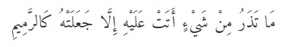 Tiadalah ia (badai topan itu) meninggalkan sesuatu pun yang dilaluinya melainkan ia meluluhlantakkannya laksana kepulan debu yang diterpa angin. (QS. al-Dzariyat [51]: 42)