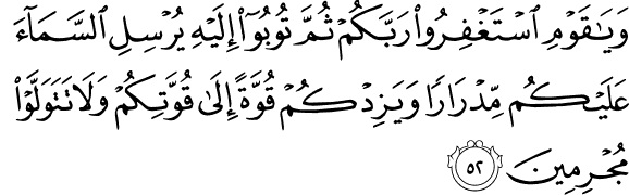 Hai kaumku! Aku tidak meminta upah kepada kalian atas seruanku ini. Upahku tidak lain hanyalah dari Allah yang telah menciptakanku. Maka tidakkah kalian memikirkan(nya)?” Dan ( dia berkata), “Hai kaumku! Mohonlah ampun kepada Tuhan kalian lalu bertobatlah kepada-Nya, niscaya Dia menurunkan hujan yang sangat deras atas kalian, dan Dia akan menambahkan kekuatan kepada kekuatan kalian, dan janganlah kalian berpaling dengan berbuat dosa. ” Kaum Ad berkata, ”Hai Hud! Engkau tidak mendatangkan kepada kami suatu bukti yang nyata, dan kami sekali-kali tidak akan meninggalkan sembahan-sembahan kami karena perkataanmu, dan kami sekali-kali tidak akan memercayaimu. Kami tidak mengatakan melainkan bahwa sebagian sembahan kami telah menimpakan penyakit gila atas dirimu.” Hud menjawab, ”Sesungguhnya aku bersaksi kepada Allah dan saksikanlah oleh kalian bahwa sesungguhnya aku berlepas diri dari apa yang kalian persekutukan, dari selain-Nya. Sebab itu, jalankanlah tipu daya kalian semuanya terhadapku dan janganlah kalian memberi tangguh kepadaku. Sesungguhnya aku bertawakal kepada Allah Tuhanku dan Tuhanmu. Tidak ada suatu binatang melata pun melainkan Dia-lah yang Memegang ubun-ubunnya. Sesungguhnya Tuhanku di atas jalan yang lurus.” (QS. Hud [11]: 52-56)