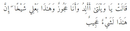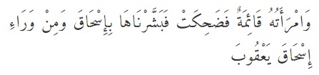 Dan istrinya berdiri (di balik tirai) lalu dia tersenyum, maka Kami sampaikan kepadanya berita gembira tentang (kelahiran) Ishaq dan dari Ishaq (akan lahir putranya) Ya’qub. Istrinya berkata, ”Sungguh mengherankan, apakah aku akan melahirkan anak padahal aku adalah seorang perempuan tua, dan ini suamiku pun dalam keadaan yang sudah tua pula? Sesungguhnya ini benar-benar suatu yang Sangat aneh. “ (QS. Hud [11]: 17-72)