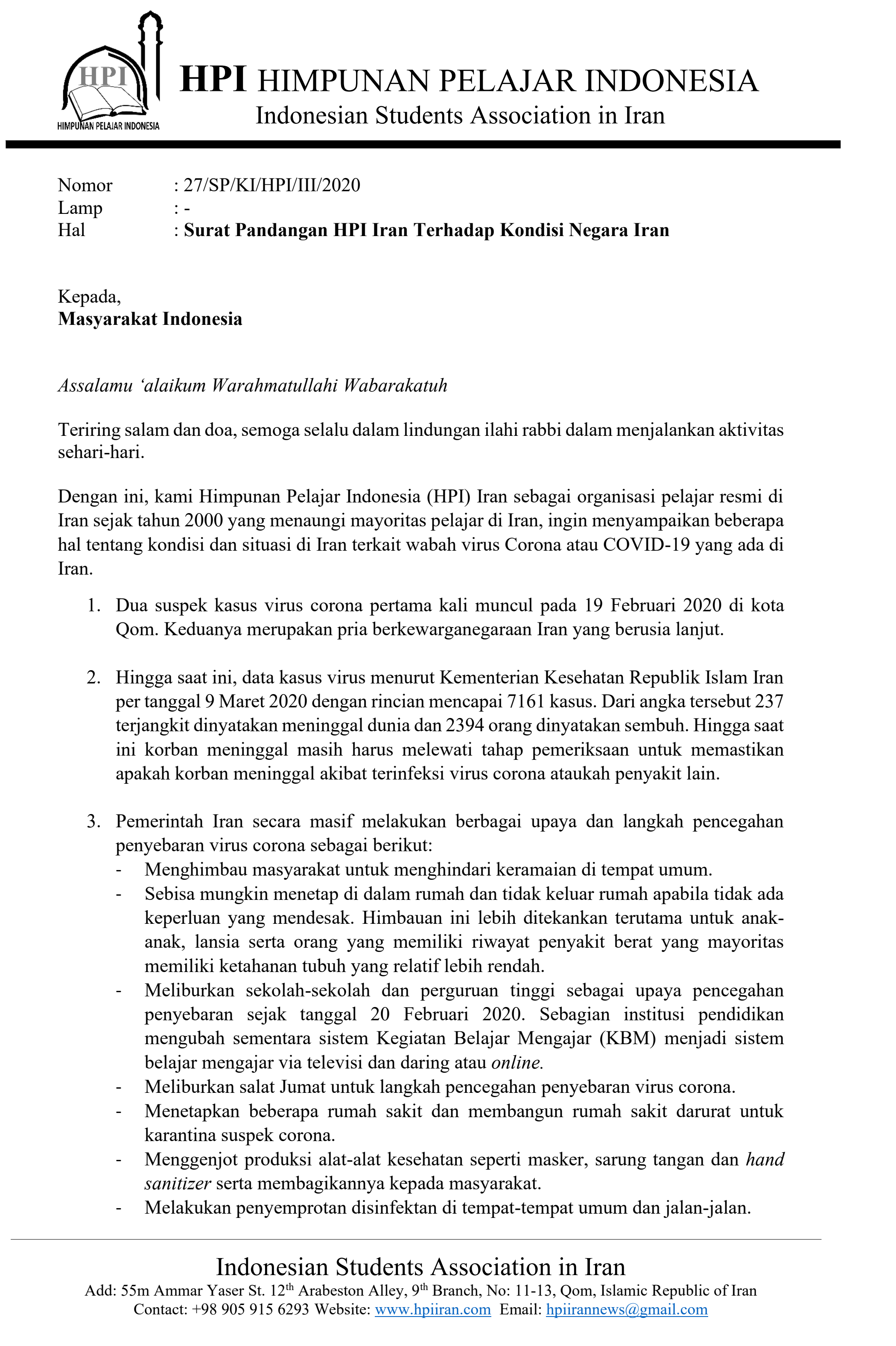 Surat pernyataan ini juga sekaligus pemberitahuan bahwa Himpunan Pelajar Indonesia (HPI) Iran selama ini tidak pernah mengeluarkan statement atau pernyataan apapun terkait dengan kondisi Iran dan virus corona dan tidak bertanggungjawab atas semua pernyataan yang dikeluarkan oleh siapapun, baik melalui media cetak maupun televisi yang mengatasnamakan pelajar Indonesia di Iran.