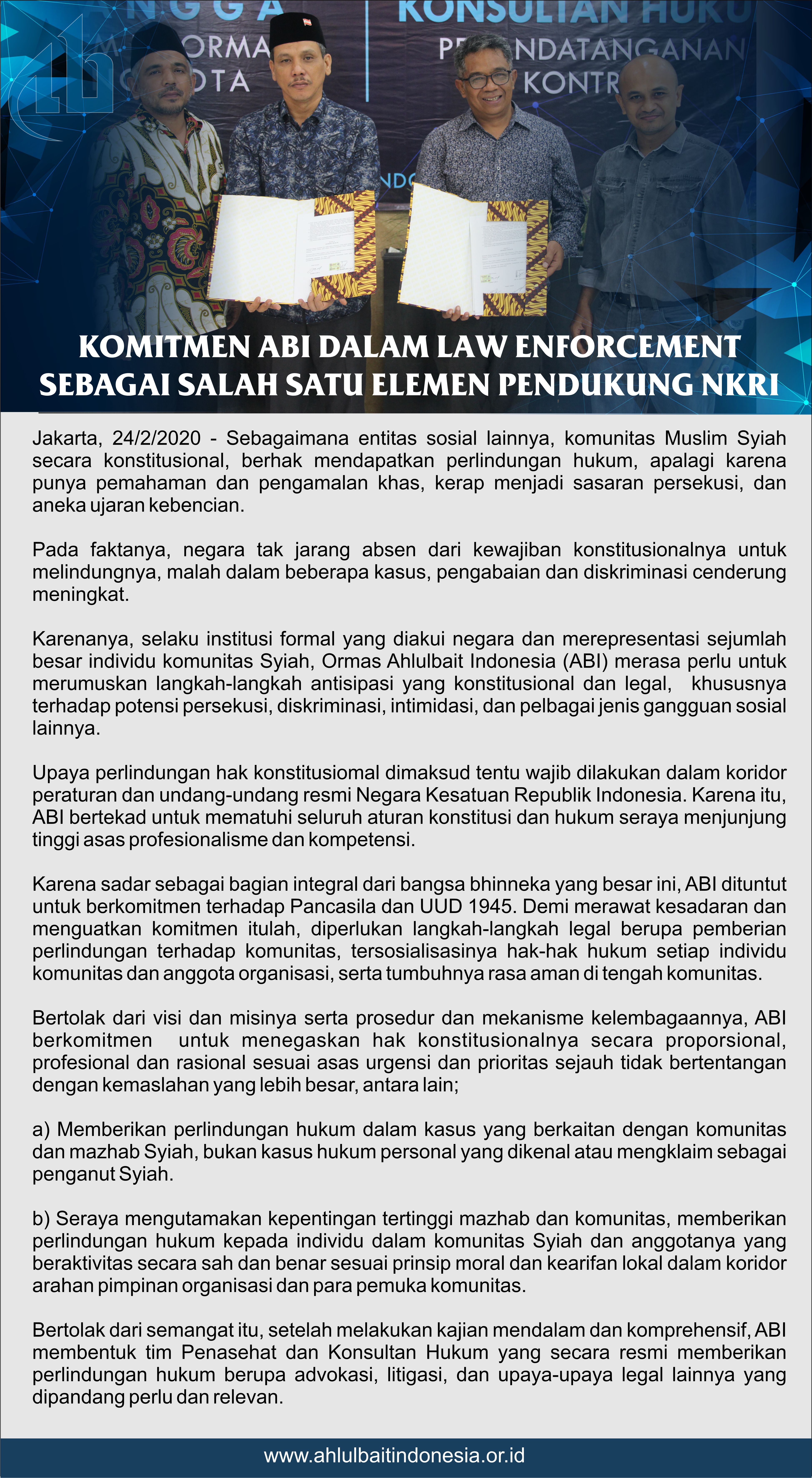Karenanya, selaku institusi formal yang diakui negara dan merepresentasi sejumlah besar individu komunitas Syiah, ormas Ahlulbait Indonesia (ABI) merasa perlu untuk merumuskan langkah-langkah antisipasi yang konstitusional dan legal, khususnya terhadap potensi persekusi, diskriminasi, intimidasi, dan pelbagai jenis gangguan sosial lainnya.