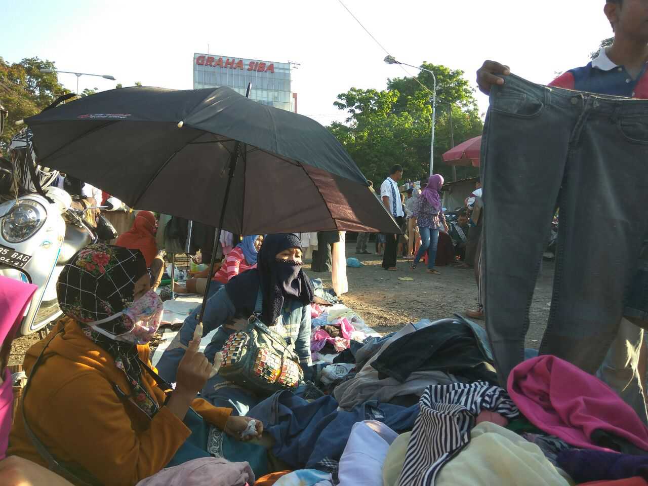 Ateman (39), salah satu pengunjung yang sempat diwawancarai sedang membeli pakaian di bazar tersebut turut mendoakan para korban bencana.