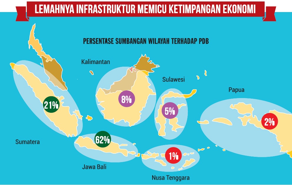 terakhir, sumbangan ekonomi wilayah Jawa-Sumatera-Bali masih terlalu dominan, yakni sekitar 85 persen. Wilayah-wilayah yang kaya sumber daya alam seperti Kalimantan, Sulawesi, Maluku, dan Papua masih terlalu kecil sumbangannya.