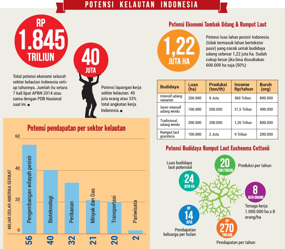 Total potensi ekonomi seluruh sektor kelautan Indonesia diperkirakan US$ 1,2 triliun per tahun atau tujuh kali lipat dari total anggaran dan belanja negara pada 2014. Dan diperkirakan mampu menyediakan lapangan kerja bagi 40 juta orang atau 33 persen total angkatan kerja Indonesia.