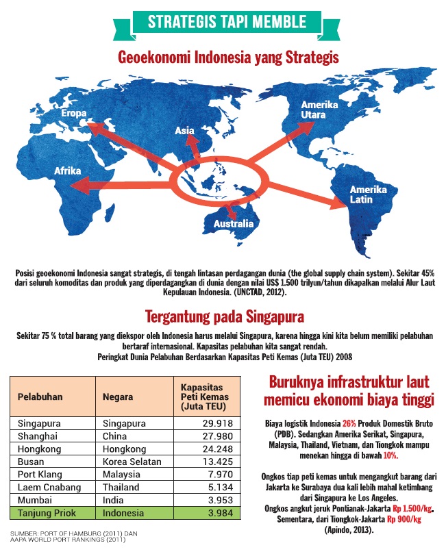 Buruknya infrastruktur, khususnya transportasi laut, menjadikan ketimpangan bertambah parah. Biaya logistik, yakni biaya angkutan bahan kebutuhan pokok dan sekunder, menjadi mahal serta memicu biaya ekonomi tinggi yang membebani negara dan masyarakat. Tak heran jika harga semen di Papua, misalnya, bisa berkali lipat dari di Jawa.