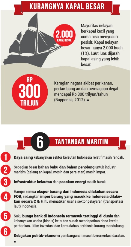 Tantangan lain: industri perkapalan kita masih lemah. Sebagian besar bahan baku dan penolong, yakni galangan kapal, mesin, dan pasokan peralatan, masih kita impor.