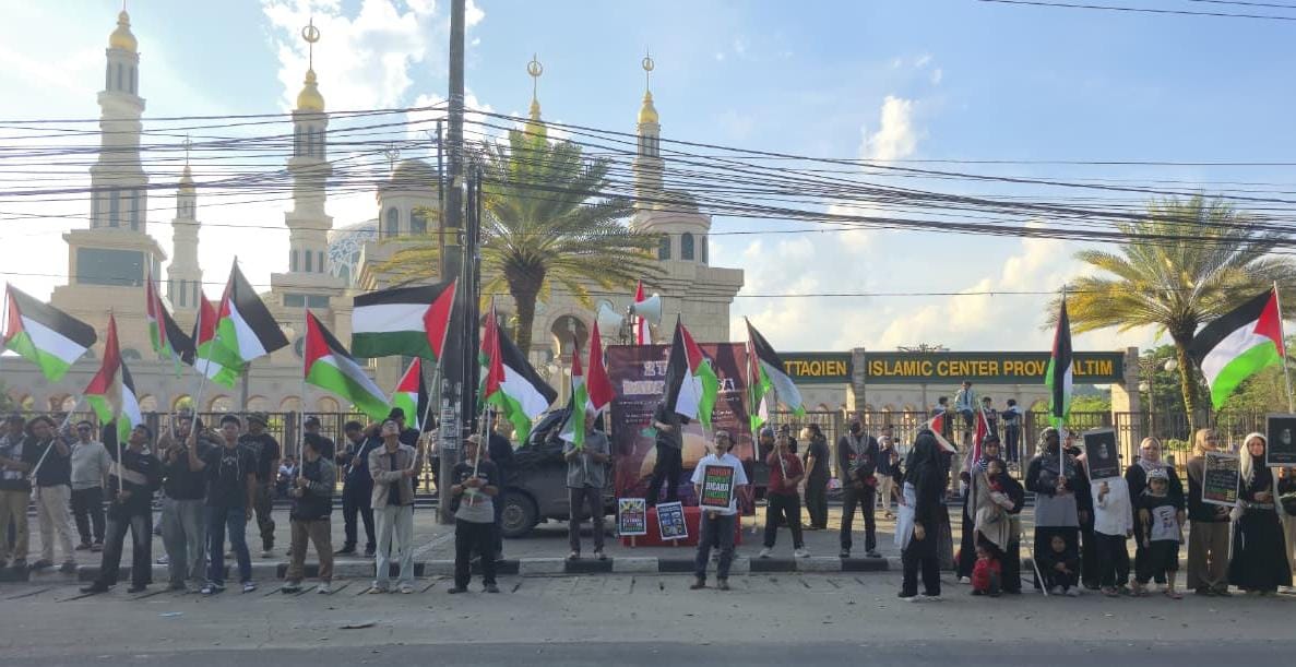 Dengan bendera Palestina dan Indonesia berkibar berdampingan, massa memenuhi pelataran masjid kebanggaan warga Samarinda. Orasi demi orasi menggema, diselingi pekikan “Merdeka Palestina!”, “Allahu Akbar!”, dan seruan penolakan terhadap penjajahan yang mengguncang suasana.