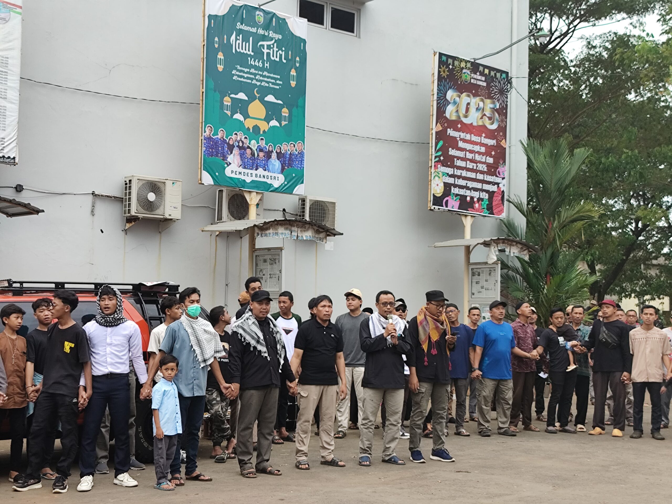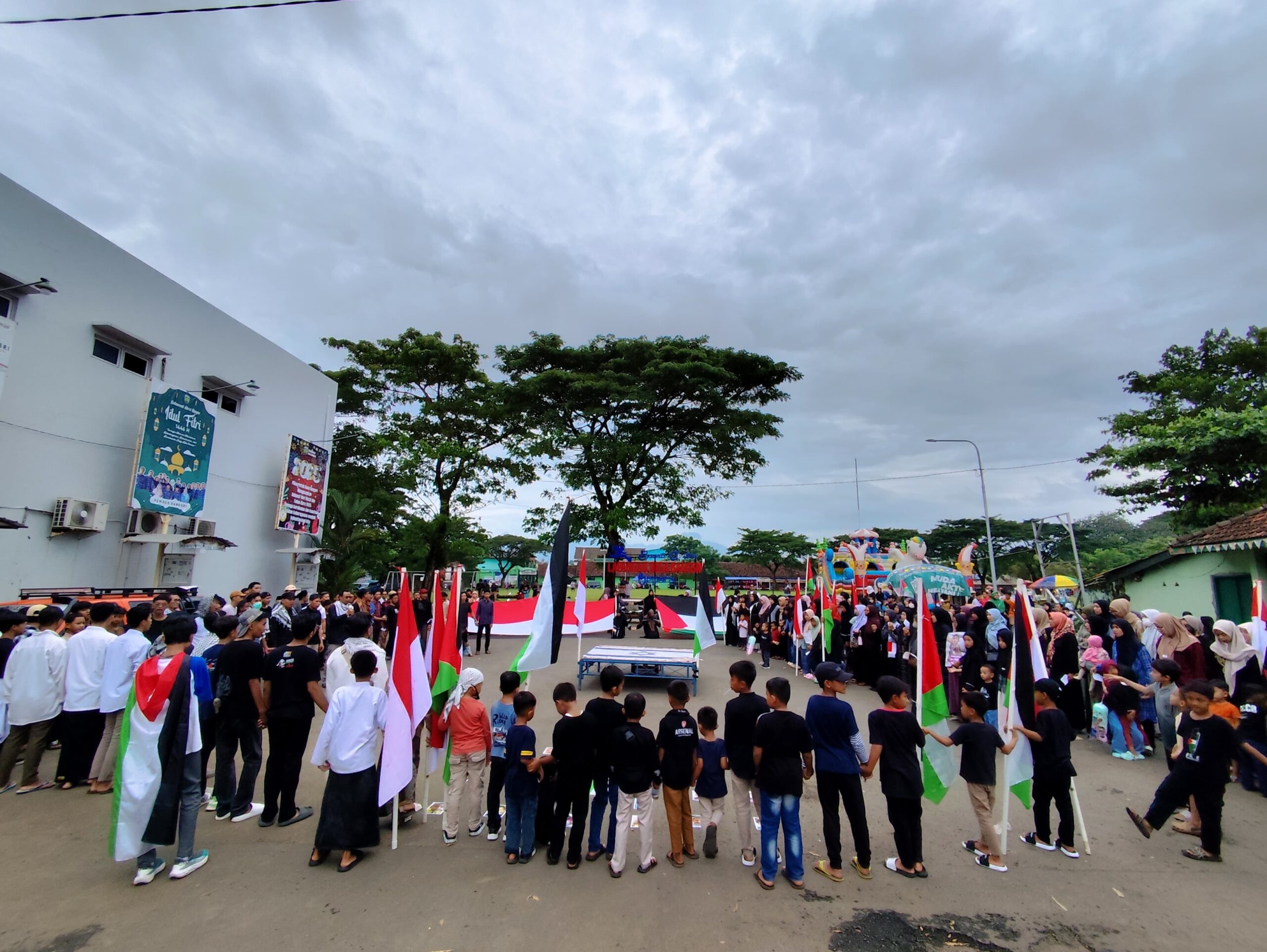 Di bawah terik matahari yang mulai meredup, ratusan warga dari berbagai kalangan; pemuda, pelajar, hingga tokoh masyarakat memadati lapangan dengan semangat menyala. Mereka membawa poster-poster dukungan, bendera Palestina, bendera Indonesia, dan sebagian mengenakan atribut khas perjuangan seperti syal hitam-putih. Pekikan takbir, yel-yel “Free Palestine!”, serta lantunan lagu perjuangan menggema nyaring, menghidupkan suasana yang penuh energi dan kepedulian.