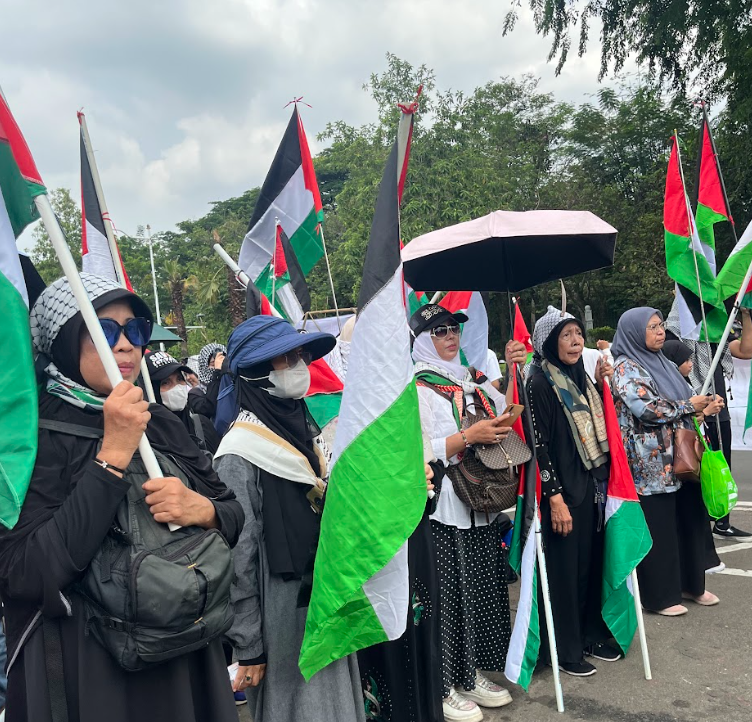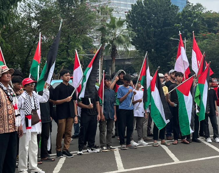 Massa yang tergabung dalam Komite Solidaritas Palestina dan Yaman (KOSPY), bersama sejumlah organisasi dan individu, menyerukan penghentian kekerasan serta penegakan keadilan bagi warga Palestina. Mereka membawa atribut dan bendera Palestina sambil meneriakkan slogan menentang genosida dan penjajahan Israel.