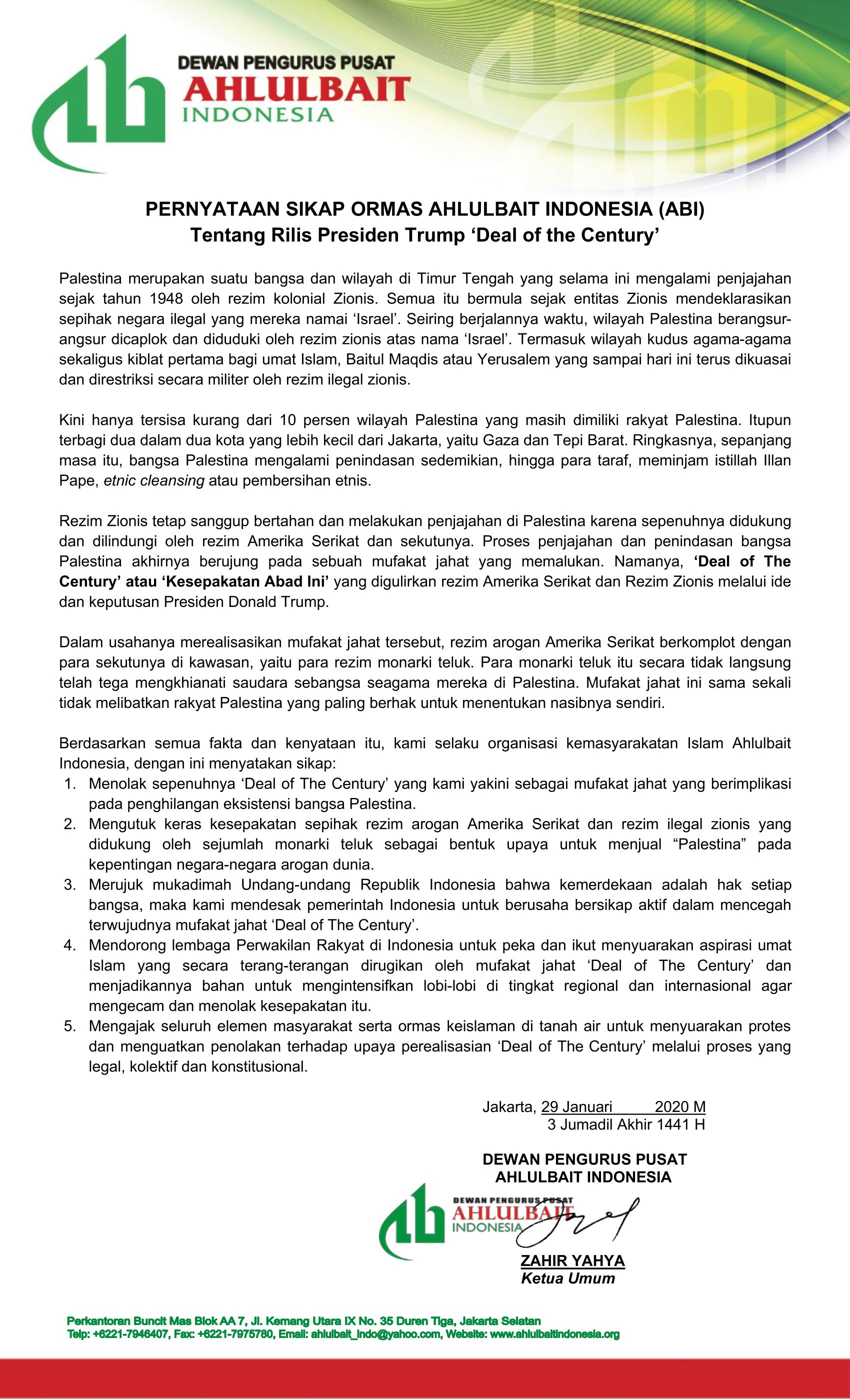 Pernyataan Sikap Ormas ABI tentang Rilis Presiden Trump ‘Deal of the Century’