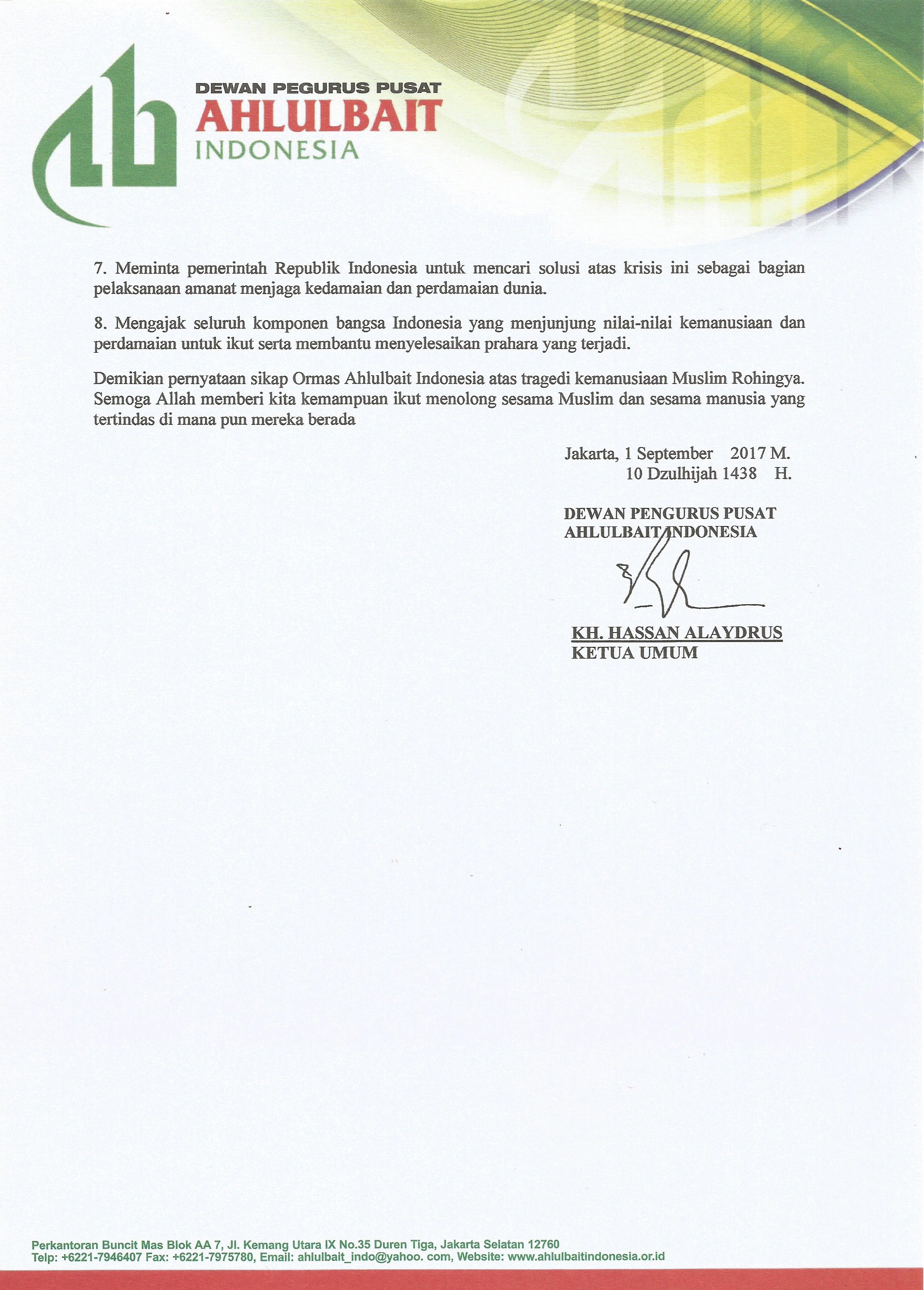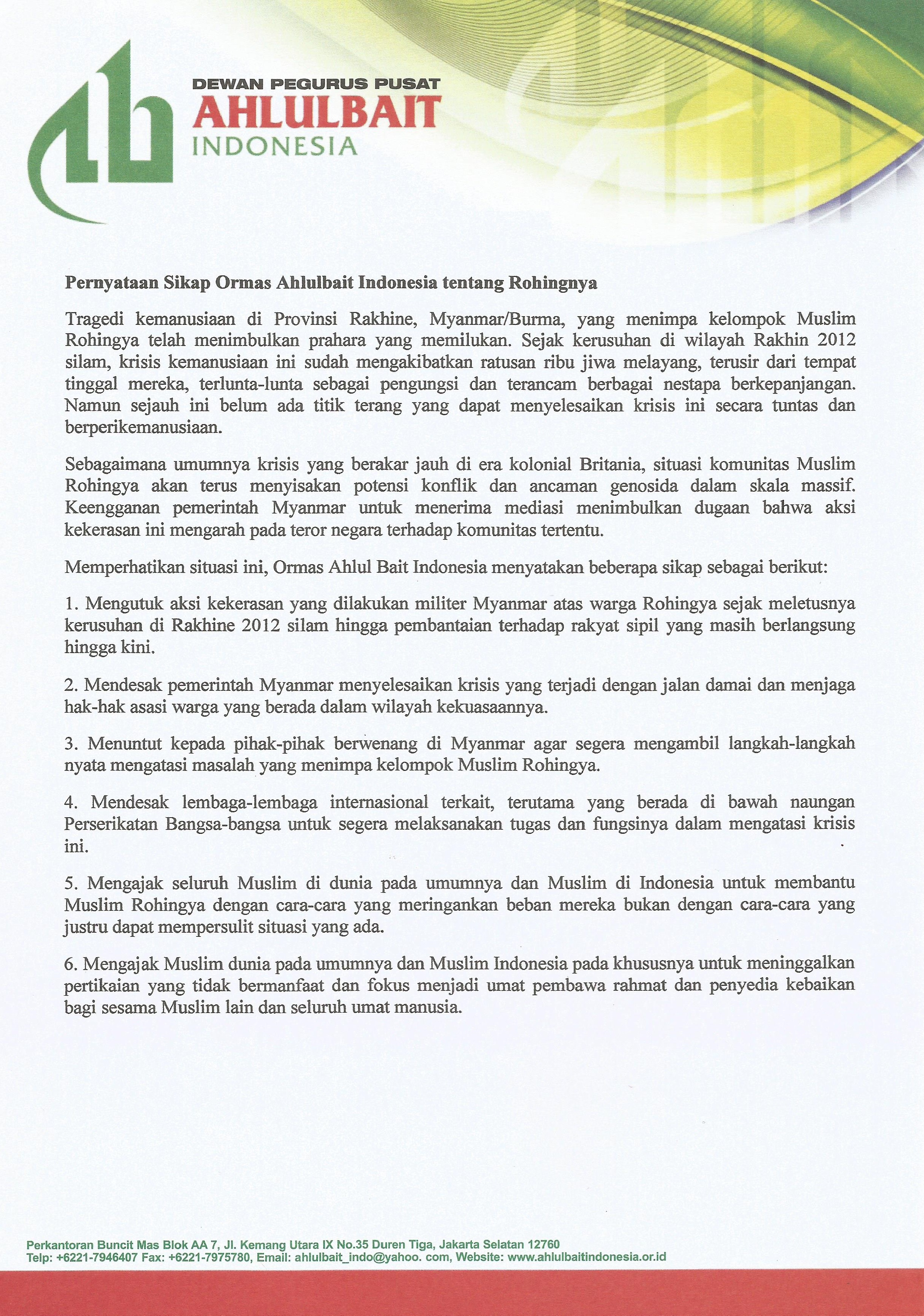 Demikian pernyataan sikap Ormas Ahlulbait Indonesia atas tragedi kemanusiaan Muslim Rohingya. Semoga Allah memberi kita kemampuan ikut menolong sesama Muslim dan sesama manusia yang tertindas di mana pun mereka berada.