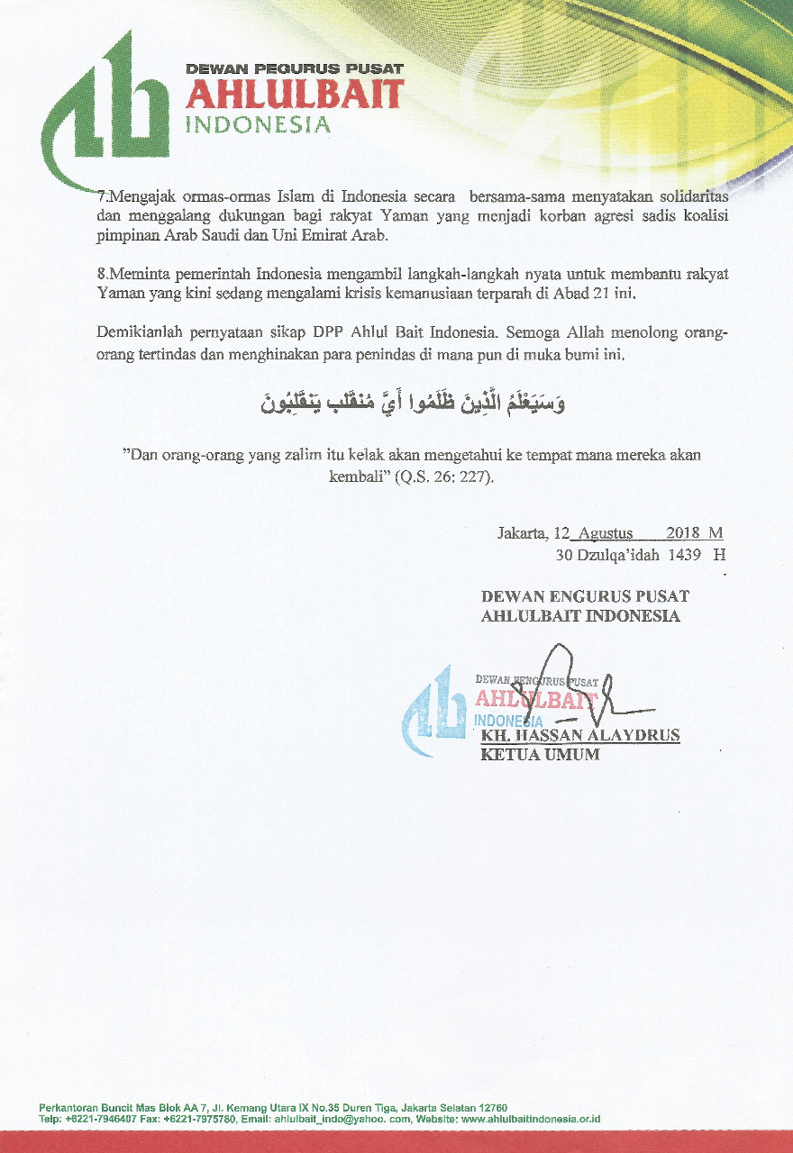 Demikianlah pernyataan sikap DPP Ahlul Bait Indonesia. Semoga Allah menolong orang-orang tertindas dan menghinakan para penindas di mana pun di muka bumi ini.