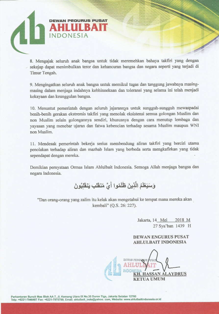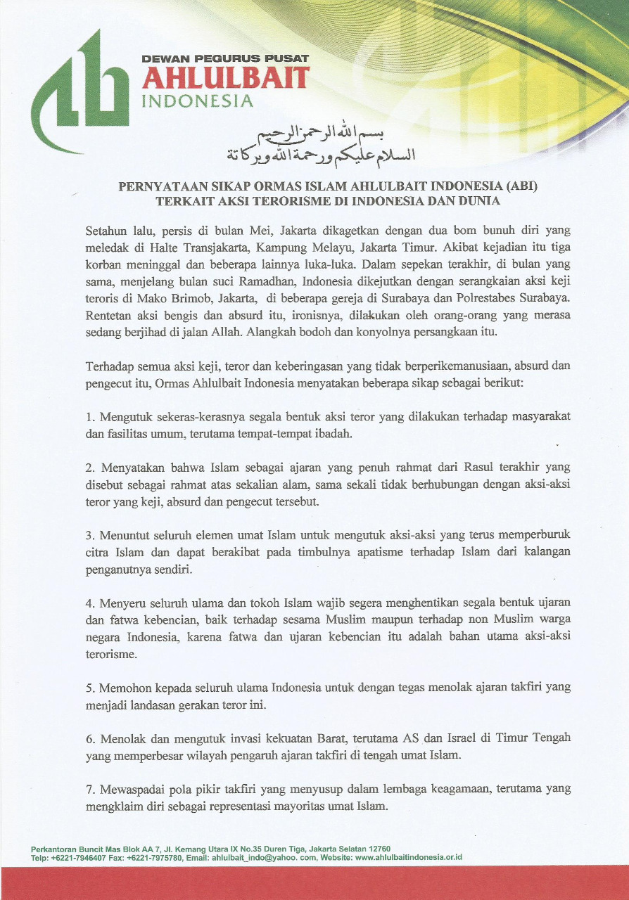 Berita Pernyataan Sikap Ormas Islam Ahlulbait Indonesia terkait Aksi Terorisme di Indonesia dan Dunia Published 8 tahun ago on 15 Mei, 2018 By Ahlulbait Indonesia Related Topics:AhlulbaitduniaindonesiaormaspernyataanSikapterorisme Up Next Tanggapan Indonesia terhadap Pembukaan Kedubes AS di Yerusalem Don't Miss Dukung Presiden Tumpas Teroris hingga Akarnya Continue Reading You may like Dari Jepara untuk Sumatera: DPD ABI Konsolidasikan Solidaritas Kemanusiaan Muslimah ABI DKI Perkuat Kemitraan dengan DPPAPP untuk Pemberdayaan Perempuan dan Perlindungan Anak Pimwil Muslimah ABI DKI Jakarta Hadiri Pelatihan Kesetaraan Gender Kesbangpol DPD ABI Samarinda Mantapkan Sinkronisasi Program Lewat Rakor Antar Lembaga 2025–2026 Pandu ABI DKI Jakarta Serahkan Donasi Palestina dari Aksi “Run For Palestine” Produk Unggulan ABI Probolinggo: Bibit Cabai Jamu Kian Diminati Masyarakat Click to comment Leave a Reply Batalkan balasanAlamat email Anda tidak akan dipublikasikan. Ruas yang wajib ditandai *Komentar * Nama * Email * Situs Web