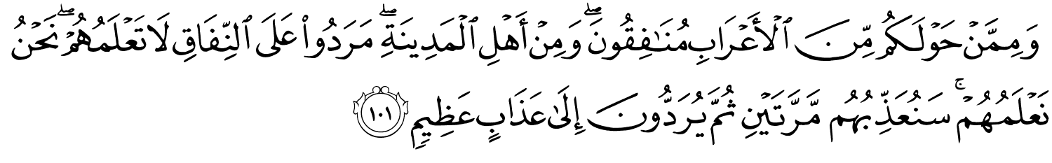 Di antara orang-orang Arab Badui yang di sekeliling-mu itu, ada orang-orang munafik; dan (juga) di antara penduduk Madinah ada sekelompok orang yang keterlaluan dalam kemunafikannya. Kamu (Muhammad) tidak mengetahui mereka, (tetapi) Kami-lah yang mengetahui mereka. Nanti mereka akan Kami siksa dua kali, kemudian mereka akan dikembalikan kepada azab yang besar. (QS. Al-Taubah [9]: 101)