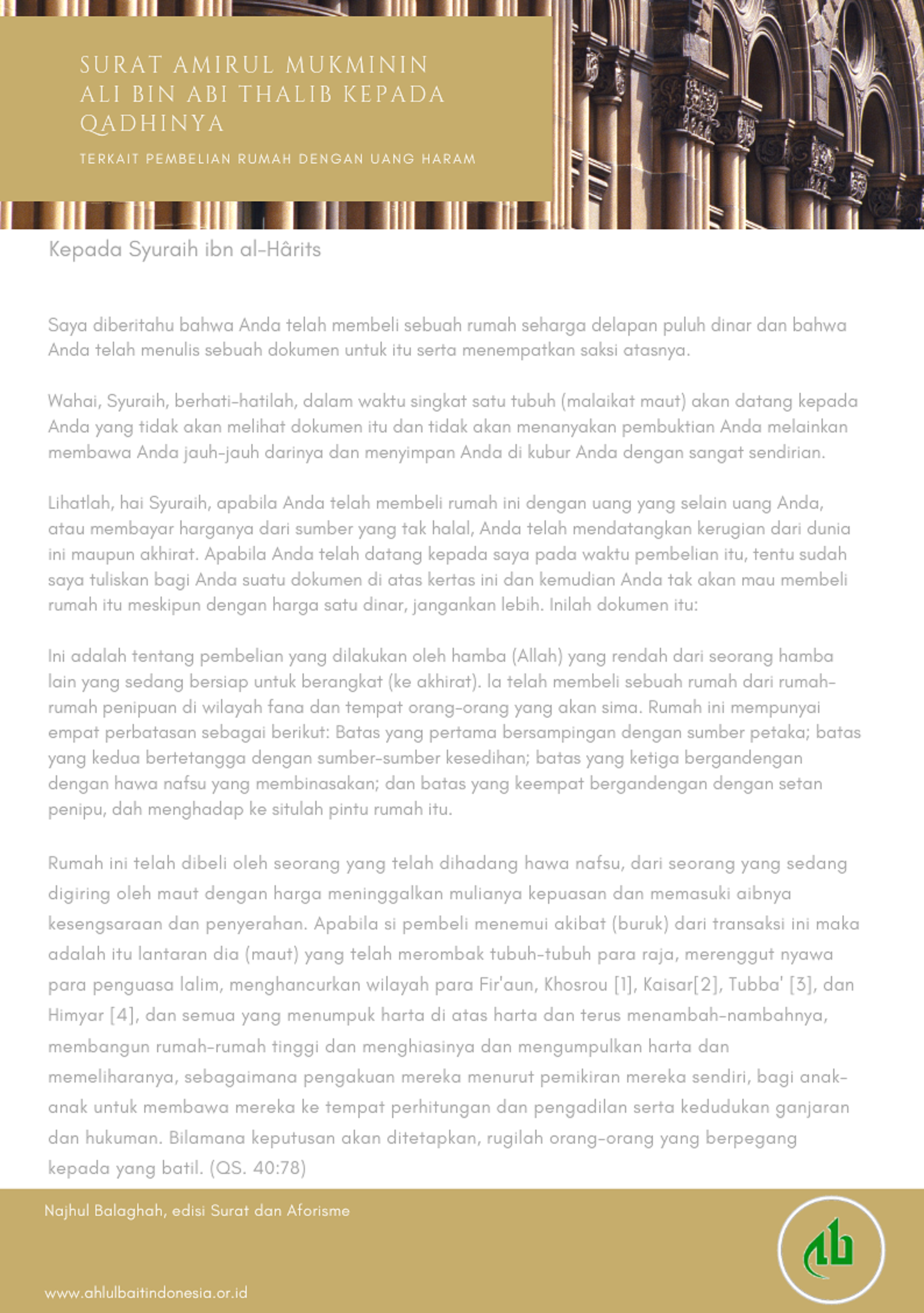 Surat Amirul Mukminin Ali bin Abi Thalib kepada Qadhinya Syuraih ibn al-Hârits terkait Pembelian Rumah dengan Uang Haram