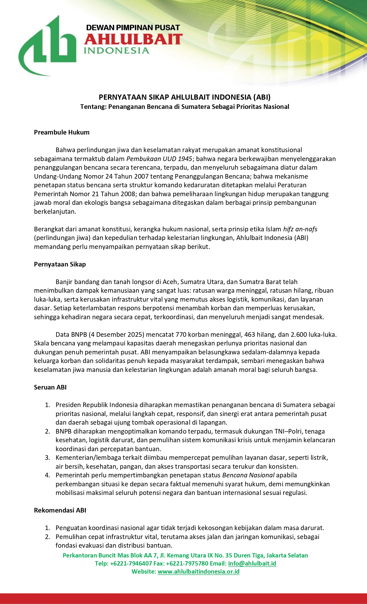 PERNYATAAN SIKAP AHLULBAIT INDONESIA (ABI) Tentang: Penanganan Bencana di Sumatera Sebagai Prioritas Nasional