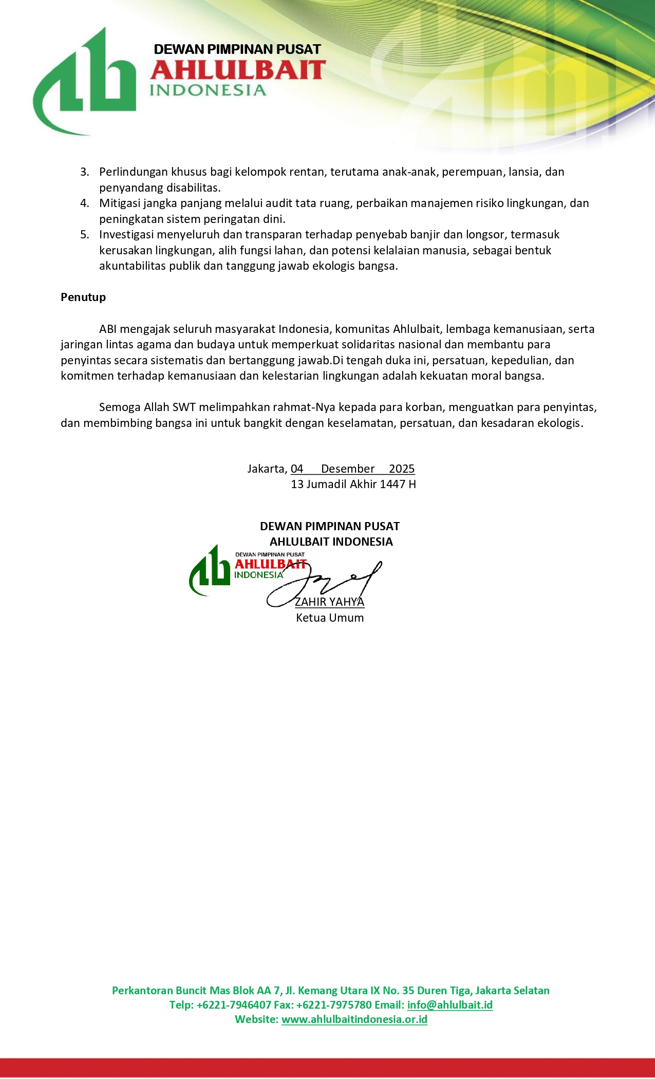 ABI mengajak seluruh masyarakat Indonesia, komunitas Ahlulbait, lembaga kemanusiaan, serta jaringan lintas agama dan budaya untuk memperkuat solidaritas nasional dan membantu para penyintas secara sistematis dan bertanggung jawab.Di tengah duka ini, persatuan, kepedulian, dan komitmen terhadap kemanusiaan dan kelestarian lingkungan adalah kekuatan moral bangsa.
