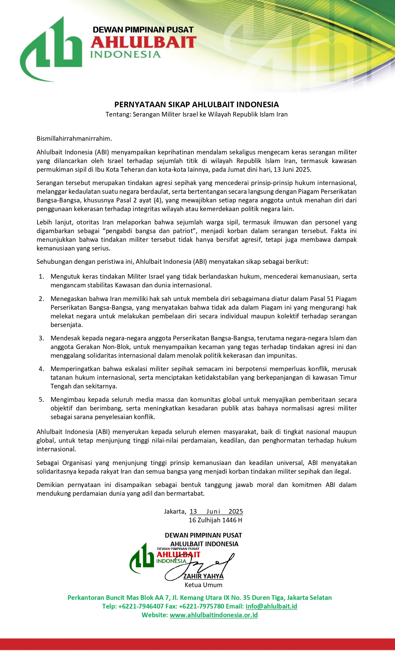 Ahlulbait Indonesia (ABI) menyerukan kepada seluruh elemen masyarakat, baik di tingkat nasional maupun global, untuk tetap menjunjung tinggi nilai-nilai perdamaian, keadilan, dan penghormatan terhadap hukum internasional.