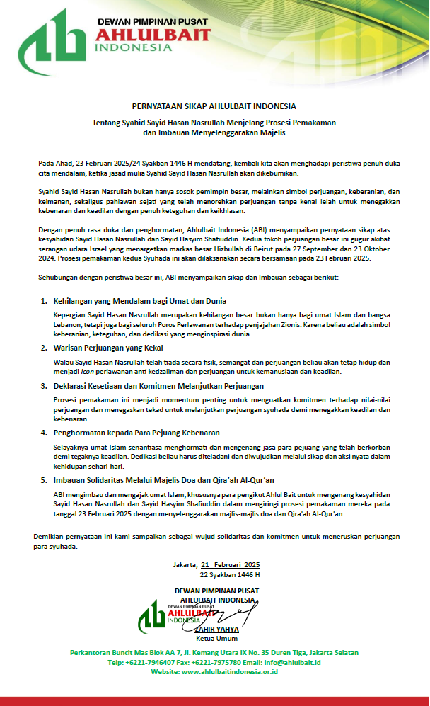Dengan penuh rasa duka dan penghormatan, Ahlulbait Indonesia (ABI) menyampaikan pernyataan sikap atas kesyahidan Sayid Hasan Nasrullah dan Sayid Hasyim Shafiuddin. Kedua tokoh perjuangan besar ini gugur akibat serangan udara Israel yang menargetkan markas besar Hizbullah di Beirut pada 27 September dan 23 Oktober 2024. Prosesi pemakaman kedua Syuhada ini akan dilaksanakan secara bersamaan pada 23 Februari 2025.