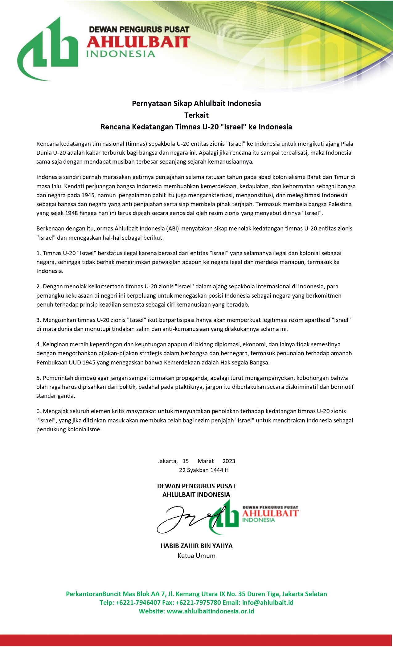 Pernyataan Sikap Ahlulbait Indonesia Terkait Rencana Kedatangan Timnas U-20 “Israel” ke Indonesia