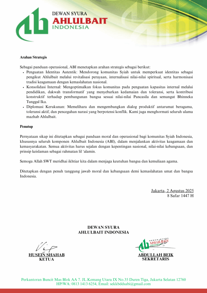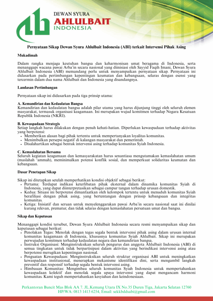 • Instruksi Organisasi: Menginstruksikan seluruh pengurus dan anggota Ahlulbait Indonesia (ABI) di semua tingkatan untuk tidak berpartisipasi dalam aktivitas yang berindikasi intervensi asing atau berpotensi merugikan kepentingan nasional.