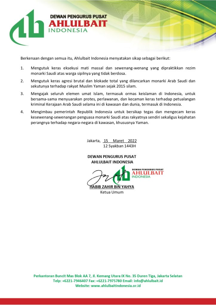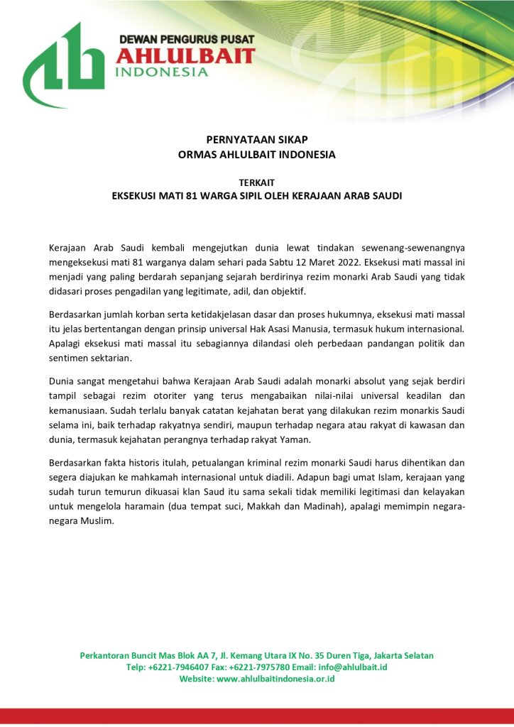 PERNYATAAN SIKAP ORMAS AHLULBAIT INDONESIA TERKAIT EKSEKUSI MATI 81 WARGA SIPIL OLEH KERAJAAN ARAB SAUDI