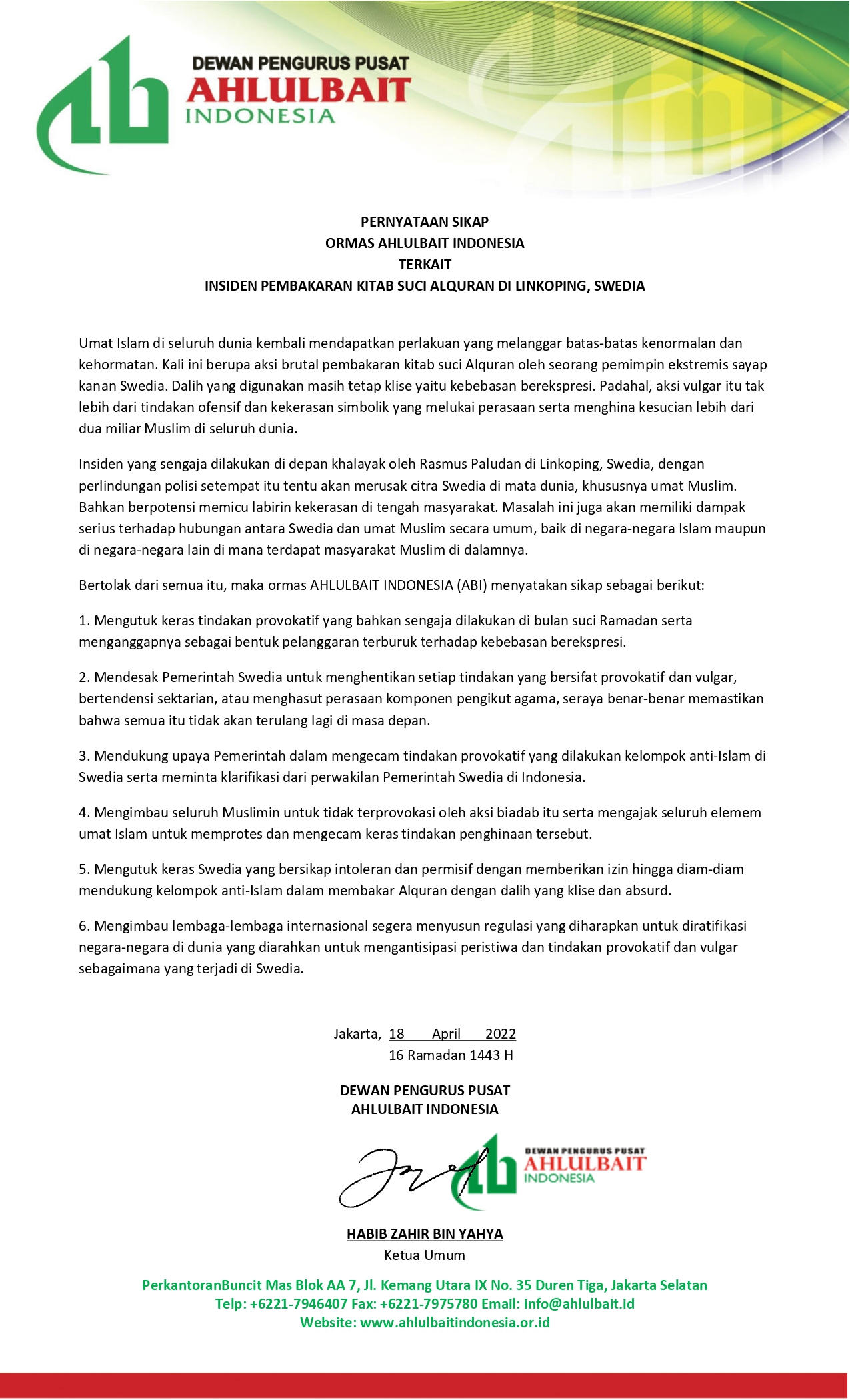 PERNYATAAN SIKAP ORMAS AHLULBAIT INDONESIA TERKAIT INSIDEN PEMBAKARAN KITAB SUCI AL-QURAN DI LINKOPING, SWEDIA