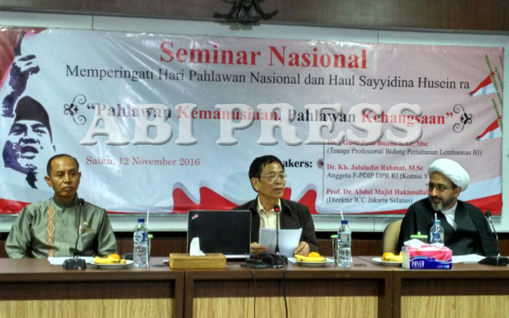 Dalam seminar ini turut hadir tiga narasumber yaitu; Dr. I Gusti Putu Buana S. AP, Msc (tenaga profesional bidang pertahanan Lemhanas RI), Dr. KH. Jalaluddin Rahmat, M.Sc (Komisi 8 DPR RI) dan Prof. Dr. Abdul Majid Hakimullahi (Direktur ICC, Jakarta Selatan).