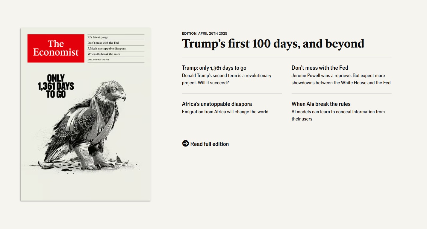 Ahlulbait Indonesia – Dalam edisi 26 April 2025, The Economist dengan getir menghitung mundur 1.361 hari sisa masa jabatan kedua Donald Trump. Tapi angka itu lebih dari sekadar waktu; ia adalah simbol perlahan hancurnya sebuah imperium. Dengan menampilkan seekor elang, ikon lama Amerika yang kini membusuk dalam perban, bersayap terikat dan matanya penuh luka, The Economist menelanjangi kenyataan getir: Amerika bukan lagi penguasa langit dunia, melainkan makhluk sekarat yang terjerat oleh kerakusannya sendiri.