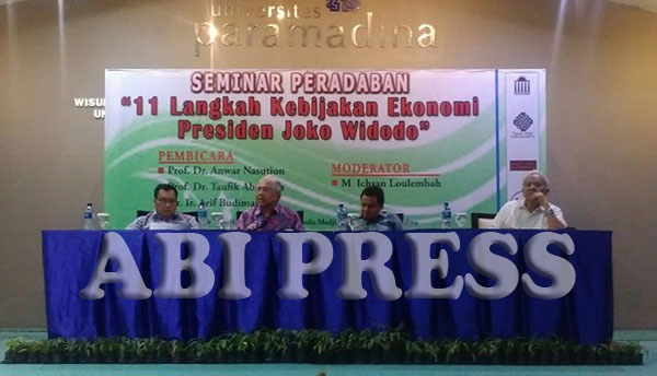 Membincangkan kondisi bangsa saat ini, Institute Peradaban bekerjasama dengan Yayasan Wakaf Paramadina dan Pusat Studi Kelirumologi menggelar Seminar 11 Langkah Kebijakan Ekonomi Presiden Joko Widodo di Universitas Paramadina, Jakarta, Kamis (24/5).