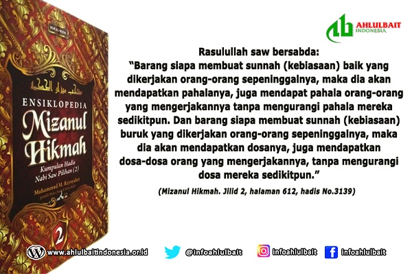 Rasulullah saw bersabda: “Barang siapa membuat sunnah (kebiasaan) baik yang dikerjakan orang-orang sepeninggalnya, maka dia akan mendapatkan pahalanya, juga mendapat pahala orang-orang yang mengerjakannya tanpa mengurangi pahala mereka sedikitpun. Dan barang siapa membuat sunnah (kebiasaan) buruk yang dikerjakan orang-orang sepeninggalnya, maka dia akan mendapatkan dosanya, juga mendapatkan dosa-dosa orang yang mengerjakannya tanpa mengurangi dosa mereka sedikitpun. (Mizanul Hikmah. Jilid 2, halaman 612, hadis No.3139)