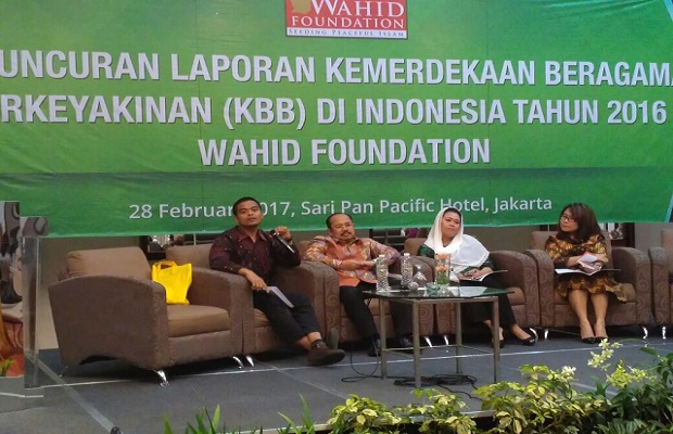 Jakarta – Wahid Foundation menggelar launching laporan Kemerdekaan Beragama dan Berkeyakinan (KBB) tahun 2016 di Sari Pan Pacific Menteng Jakarta Pusat. Terselenggara pada hari Selasa, 28 Februari 2017, kegiatan ini dihadiri Yenny Wahid (Direktur Wahid Foundation), Jaleswari Pramodhawardani (Staf Presiden RI), Amzulian Rifai (Ketua Ombudsman RI), dan Nur Zaman (Perwakilan dari P impinan Pusat GP Ansor).