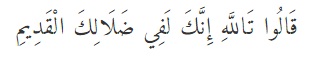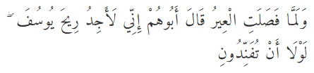 Tatkala kafilah itu telah keluar (dari negeri Mesir) berkata ayah mereka, ”Sesungguhnya aku mencium bau Yusuf, sekiranya kamu tidak menuduhku lemah akal ( tentu kamu membenarkan aku). ” Anak-anaknya berkata, ”Demi Allah! Sesungguhnya kamu masih dalam kekeliruanmu yang dahulu. “ (QS. Yusuf [12]: 94-95)