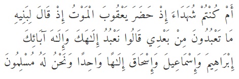 Adakah kamu hadir ketika Ya’qub kedatangan (tanda-tanda) maut, ketika dia berkata kepada anak-anaknya, ”Apa yang kamu sembah sepeninggalku?” Mereka menjawab, ”Kami akan menyembah Tuhanmu dan Tuhan nenek moyangmu, Ibrahim, Ismail dan Ishaq; (yaitu) Tuhan Yang Maha Esa dan kami hanya tunduk patuh kepada-Nya.” (QS. al-Baqarah [2]: 133)