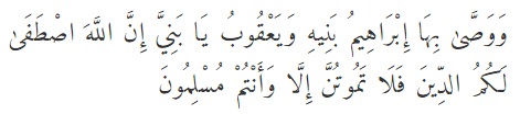 Dan Ibrahim telah mewasiatkan ucapan itu kepada anak-anaknya, demikian pula Ya’qub. (Ibrahim berkata), ”Hai anak-anakku! Sesungguhnya Allah telah memilih agama ini bagimu, maka janganlah kamu mati kecuali dalam memeluk agama Islam.” (QS. al-Baqarah [2]: 132)